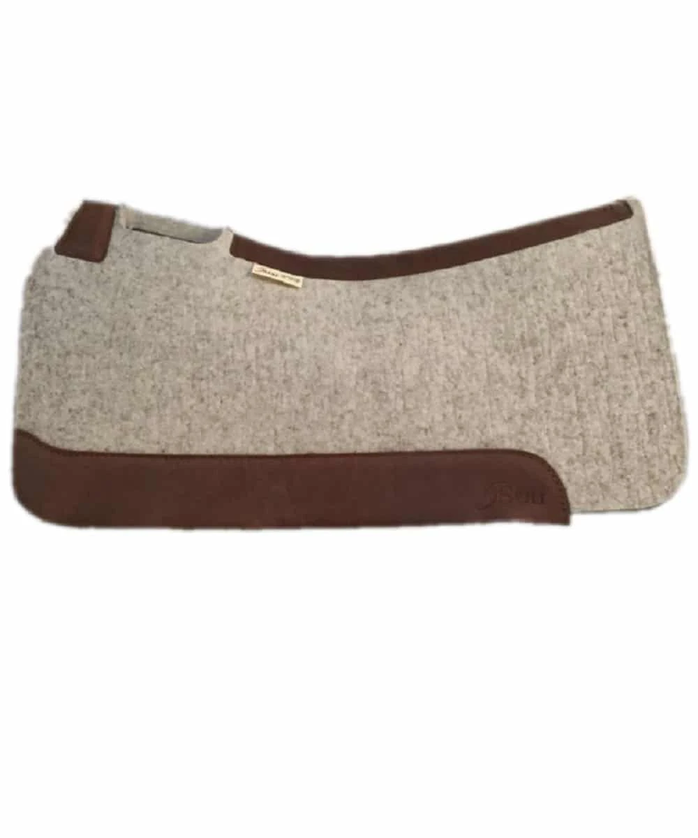 Barrel Racing, Trail Riding, Roping; 100% Virgin Wool; Moisture Wicking; Wear Leathers For Protection And Durability; Oatmeal Felt, Chocolate Brown Leather; Hand Made In USA; Square Skirt: 30″ x 30″; 3/4″ Thick; Style #2WN