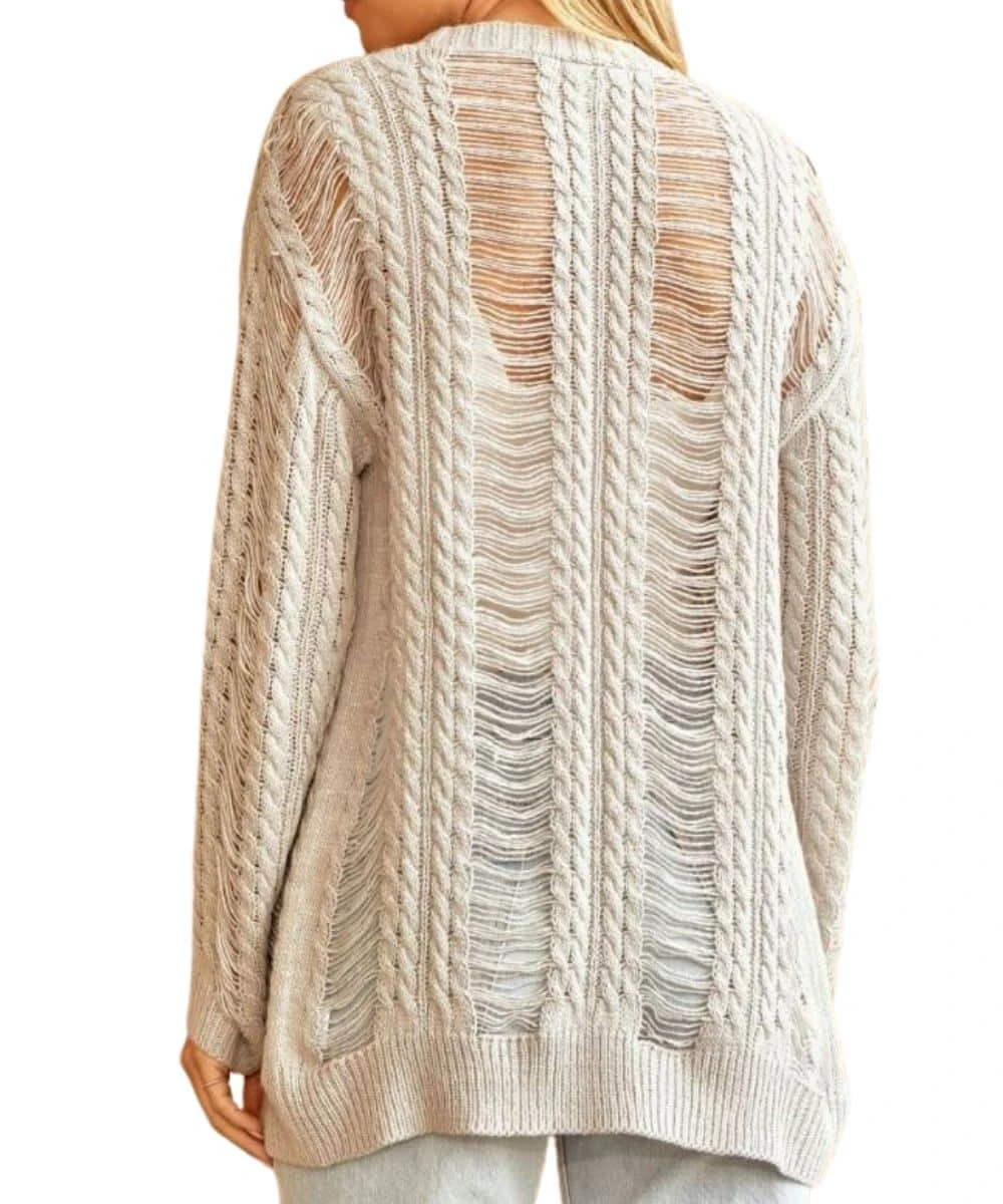 100% Acrylic; Color: Oatmeal; Cable Knit With Distressed Look All Over; Long Sleeves; Lightweight; Style #PT10928