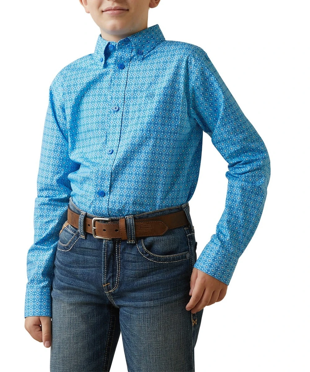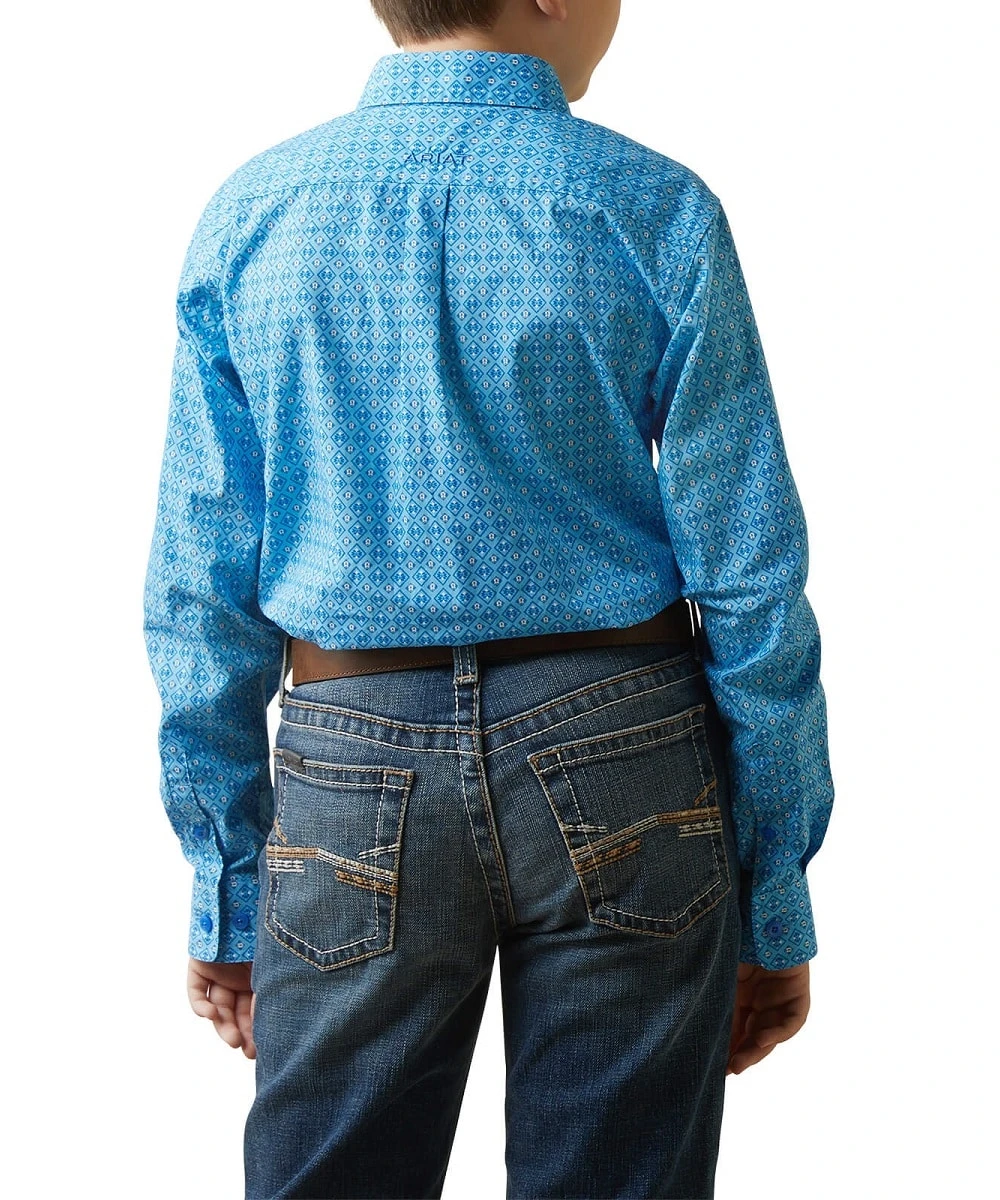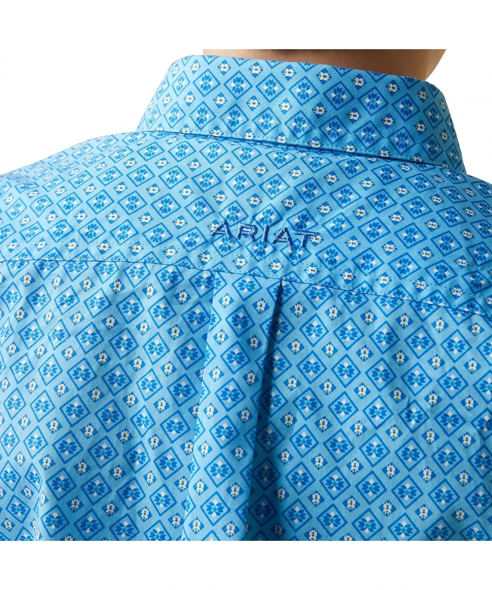 100% Cotton; Classic Fit With Extra Length For Tucking; Long Sleeve; Classic Button Down Collar, Placket, And Cuffs; Open Left Chest Pocket With Logo Embroidery; Greater Arm Mobility For Freedom Of Movement; Straight Back Yoke With Pleat And Logo Embroidery; Color: Blue Grotto Geo Print; Style #10043714