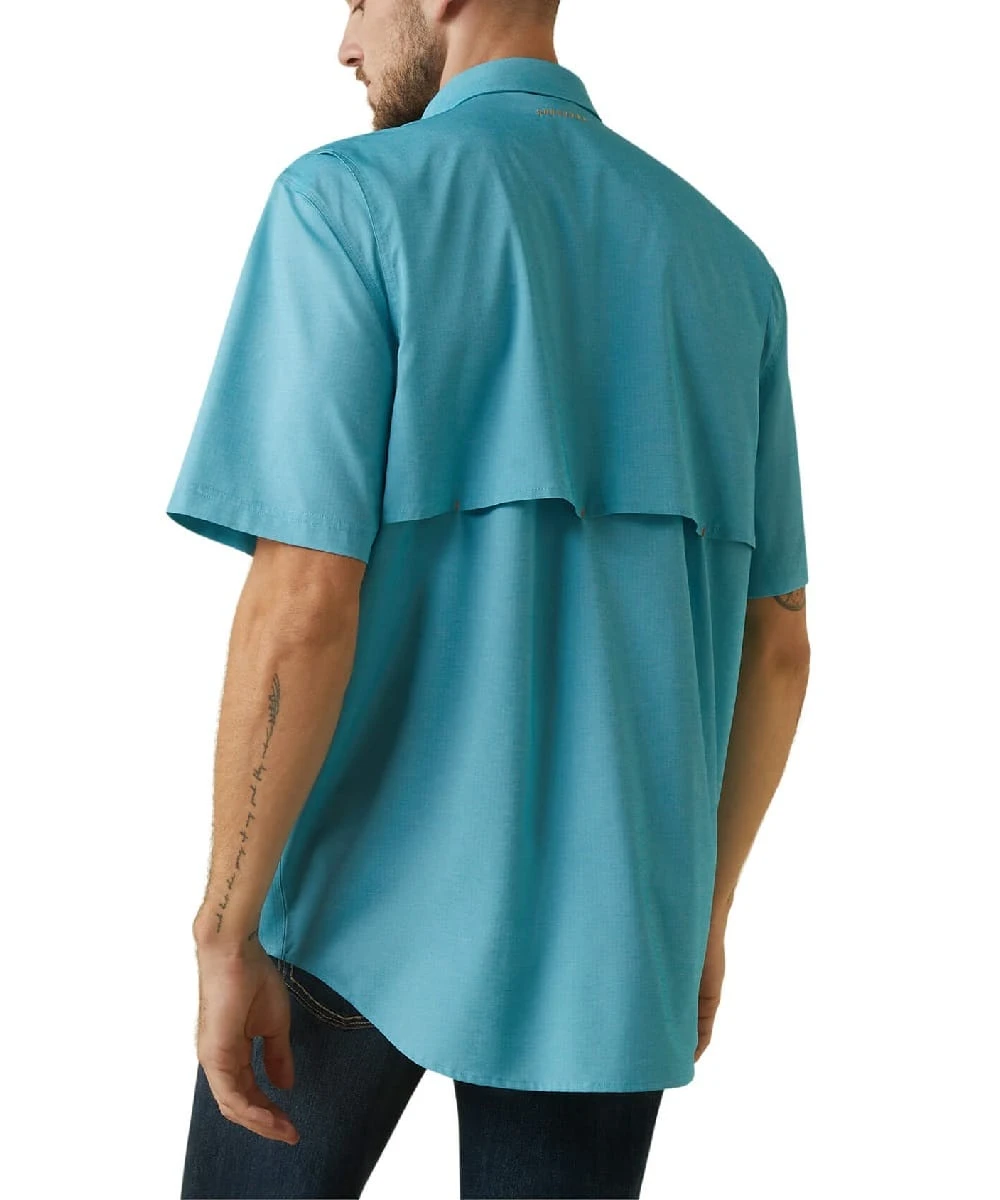 92% Polyester/8% Spandex, 4 Oz. Technical DuraStretch Fabric; Short Sleeve; Button Down Collar; Two Button Flap Pockets; Mesh Lining; Vent Panels; Greater Arm Mobility Seam Construction For Maximum Range Of Motion; Moisture Movement Technology Wicks Moisture Away From Skin; VentTEK Technology Features Body Mapping To Enable Air Flow And Regulate Body Temperature; Drop Tail Hem; Metal Buttons; Hidden Sunglasses Cloth; Embroidered Logos; Color: Caribbean Sea Heather; Style #10043580
