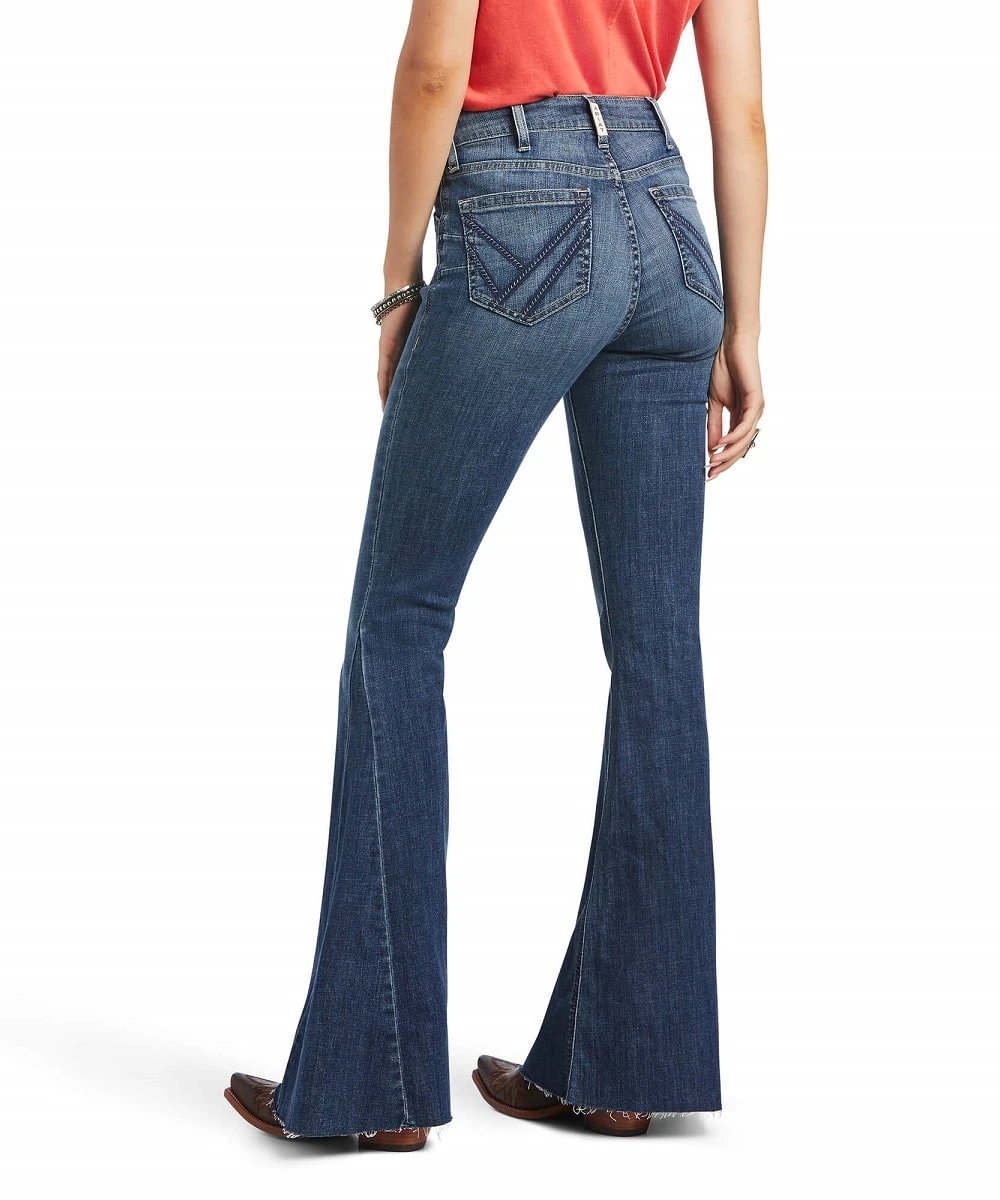 95% cotton/4% Estrerell-P/1% Lycra Spandex, 9.75 Oz. Performance Stretch Denim; High Rise; Medium Wash; Whiskers; Fading; Waist Band That Won’t Gap; Seat That Won’t Sag; Five Pocket Styling; Embroidered Fashion Back Pockets; Raw Edge Extreme Flared Leg; Color; Canadian; Style #10040803