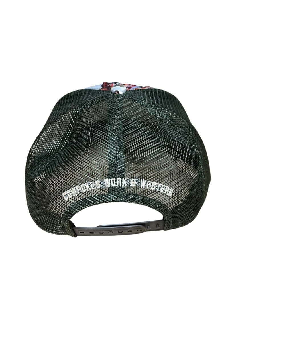 HEATHER/TAN: Six Panel Construction; Heather Grey Front Center; Tan Bill; Tan Mesh Back; Cowpokes Work And Western Logo Patch On Front Center Crown; Snap Back Closure; SAMRAY/ROYAL BLUE: Five Panel Construction; Royal Blue Front Center And Bill; Tan Mesh Back; White And Blue Cowpokes Logo Patch On Front Center; Blue Cowpokes Logo Embroidery On Side; Snap Back Closure; OLIVE: Six Panel Construction; Cowgirl And Cactus Print On Front Crown And Bill; Olive Green Mesh; Round Cowpokes Logo Patch On Left Front Crown; Embroidered ‘Cowpokes Work And Western’ On Back Mesh; Snap Back Closure; Style #CWWPATCH