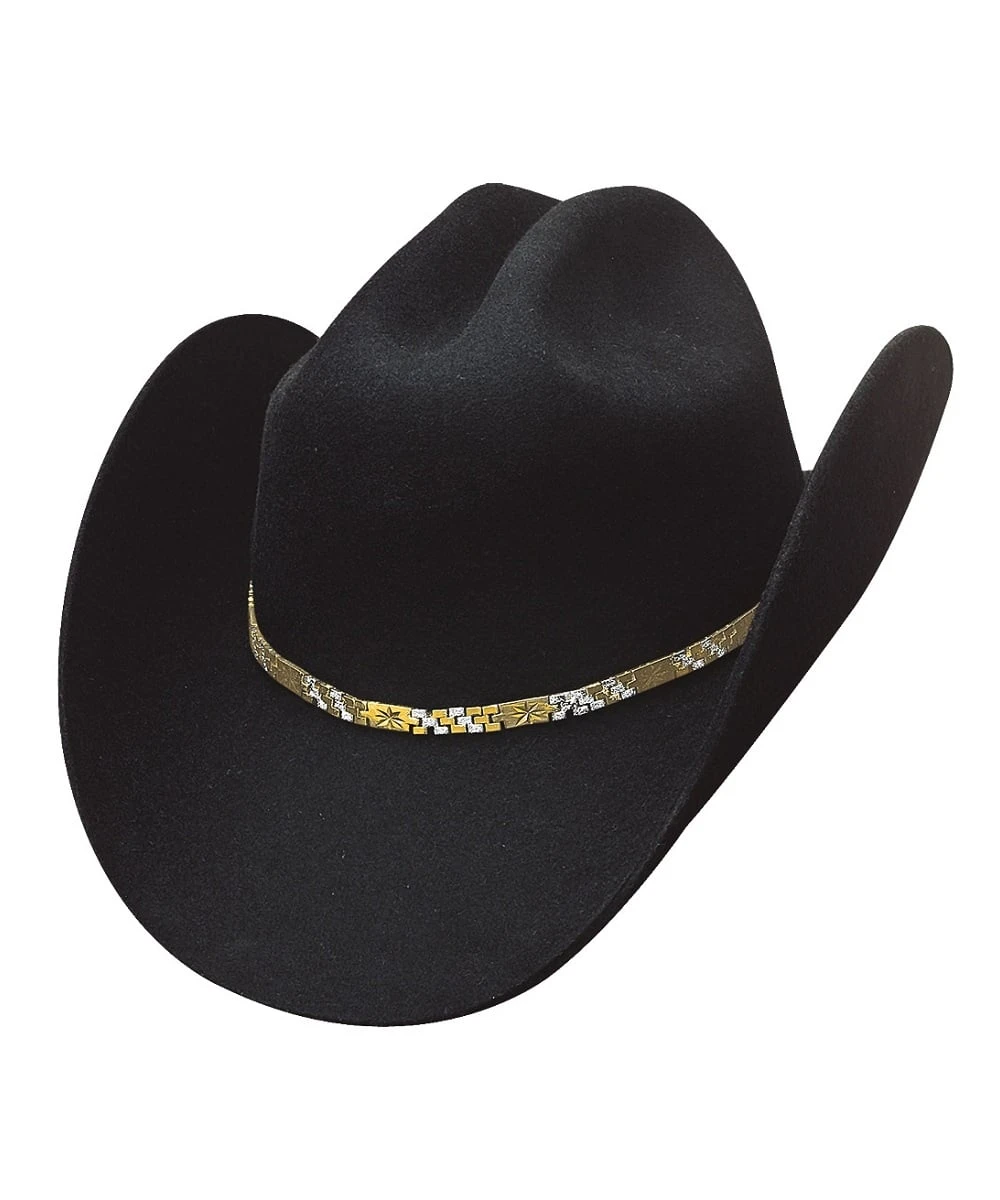 8X Black Fur Blend Felt; Color: Black; 3 3/4″ Vaquero Brim; Cattleman Shaped Crown; Gold And Silver Chain-Like Hat Band; Style #0693BL
