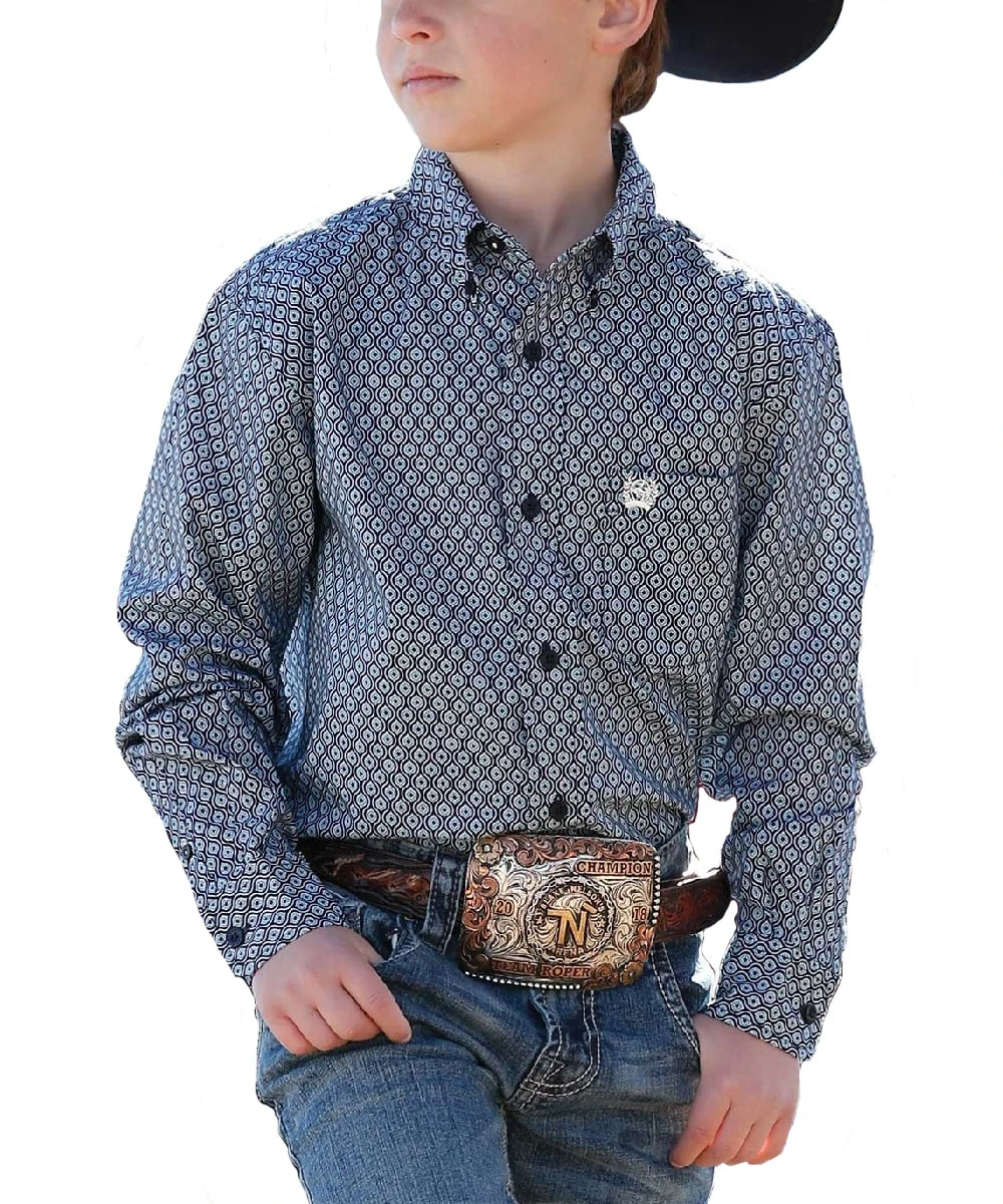 100% Cotton; Long Sleeve; Button Down Collar; Button Front And Cuffs; Single Open Chest Pocket With Logo Embroidery; Black, White And Grey Geometric Print; Style #MTW7060270