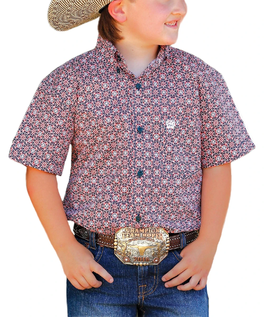 Printed Cotton Plain Weave; Button Down Collar; Single Open Pocket With Cinch Embroidery; Color: Red And Blue Medallion Print; Short Sleeve; Style #MTW7140026