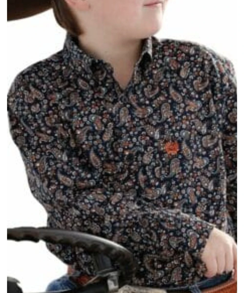 100% Cotton; Long Sleeve; Button Down Collar, Placket, And Cuffs; Open Left Chest Pocket With Logo Embroidery; Color: Navy Blue With Orange, White, Steel Blue, And Marigold; Paisley Print; Style #MTW7060297