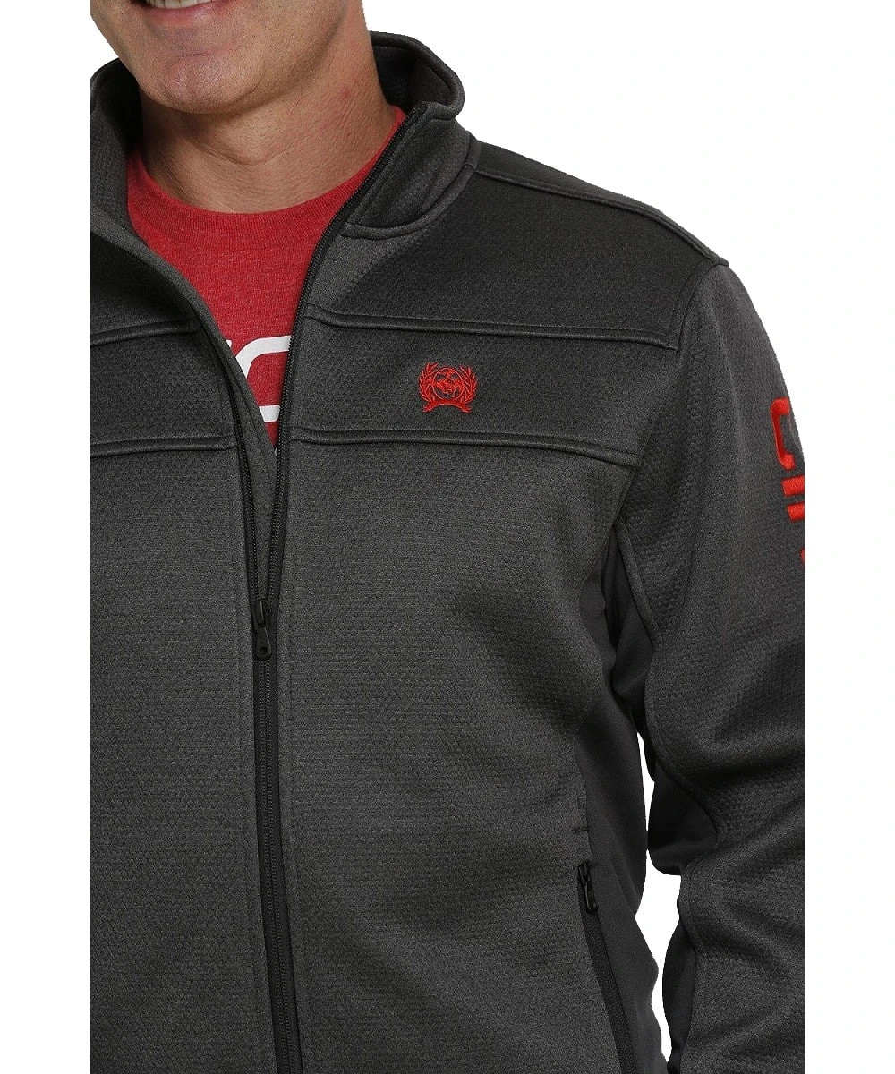 Poly-Spandex Sweater Knit Material; Lightweight Long Sleeve Jacket; Mandarin Collar; Full Zip Closure; Two Zippered Hand Pockets; Red Logo Embroidery On Chest, Sleeve, And Back; Bonded Finish; Color: Color Blocked Charcoal; Style #MWJ157001X
