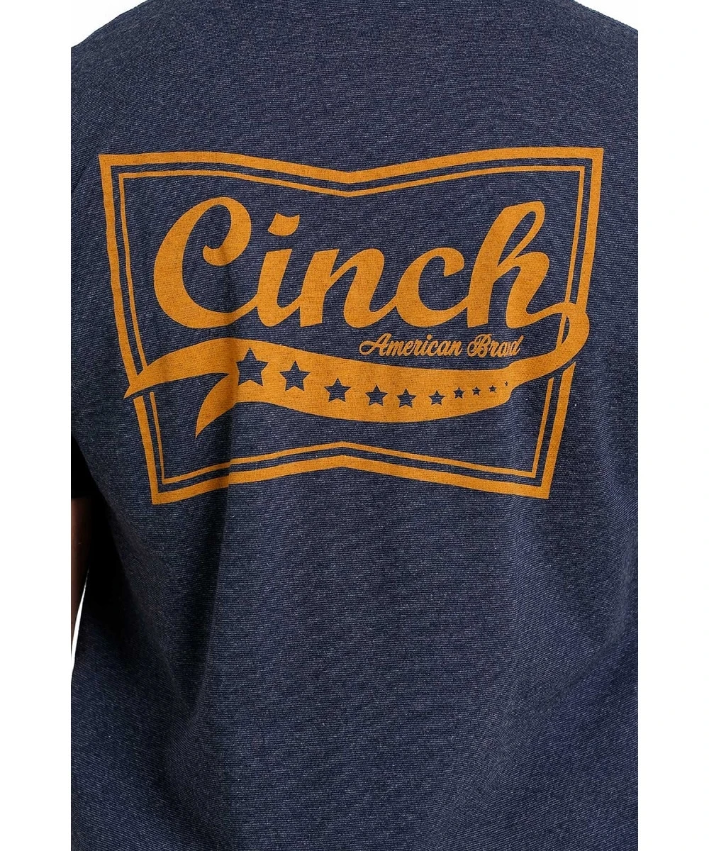 75% Cotton/25% Polyester; Crew Neck; Short Sleeve; Front Chest Logo Screen Print; Cinch Graphic On Back; Color: Heather Navy With Toasted Mustard Yellow Lettering; Style #MTT1690521