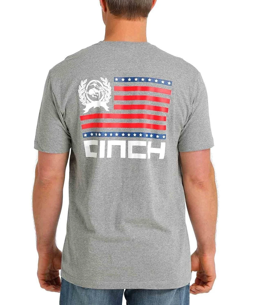 75% Cotton/25% Polyester; Crew Neck; Color: Heather Gray; Front White Cinch Logo Print; Back Red, White And Blue Cinch Logo American Flag; Style #MTT1690502