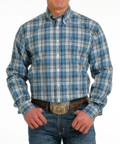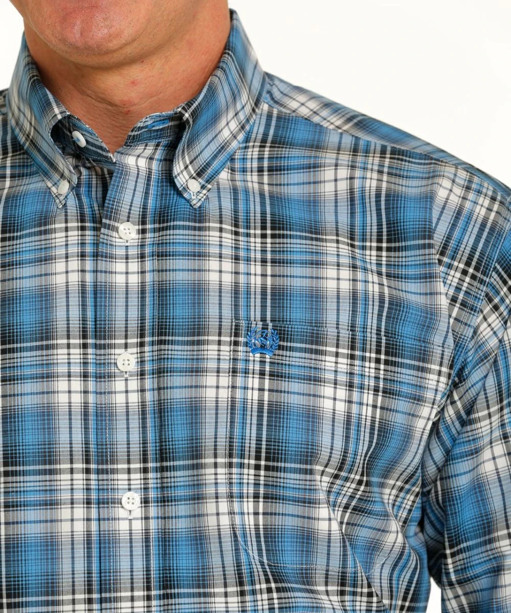 Cotton Plain Weave; Classic Fit; Long Sleeve; Button Down Collar, Placket, And Cuffs; Cream Buttons; Single Open Chest Pocket With Logo Embroidery; Color: Cream/Light Blue/Navy Plaid; Style #MTW1105514