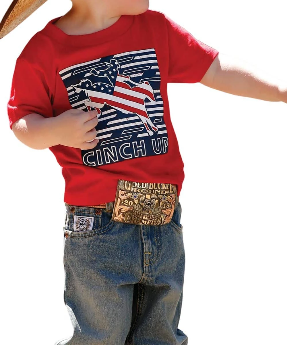 Cotton; Short Sleeve; Crew Neck; Front Screen Print Reads “Cinch Up”; Color: Red/White/Blue; Style #MTT7671075