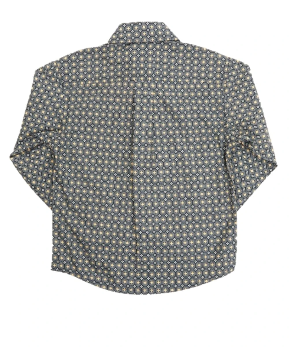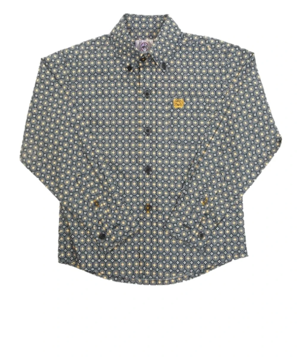 100% Cotton; Relaxed Fit; Long Sleeve; Button Down Collar; Button Down Front Placket; Navy Buttons; Open Pocket On Chest With Logo Embroidery; Button Barrel Cuffs; Straight Back Yoke With Pleat; Gold Diamond Geometric Pattern Throughout; Style #MTW7061292