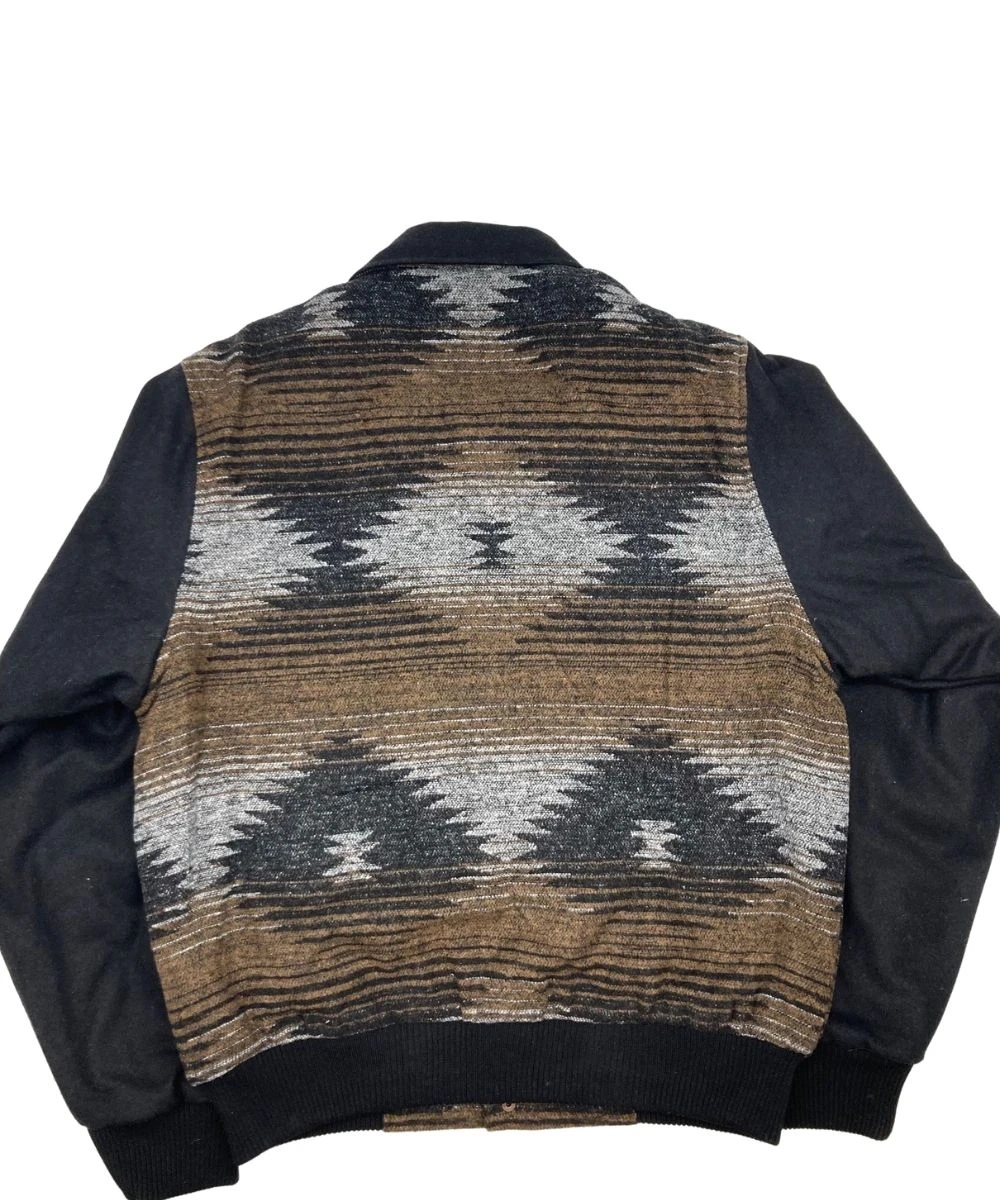 100% Polyester; Brown And Black Serape Print; Black Sleeves And Collar; Fold Over Collar; Snap Closure; Ribbed Cuffs And Waist Band; 2 Exterior Pockets; 1 Interior Conceal Carry Pocket; Style #CR40249