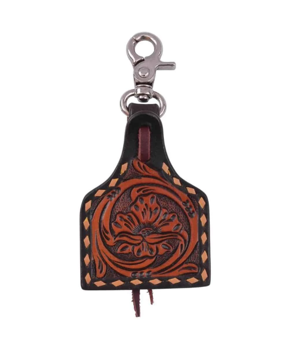 Leather; Ear Tag Shape With Floral Tooled Design; Buck Stitching Along Edges; Scissor Snap; Works On Saddles, Purses, Luggage, And More; Style #SC1010