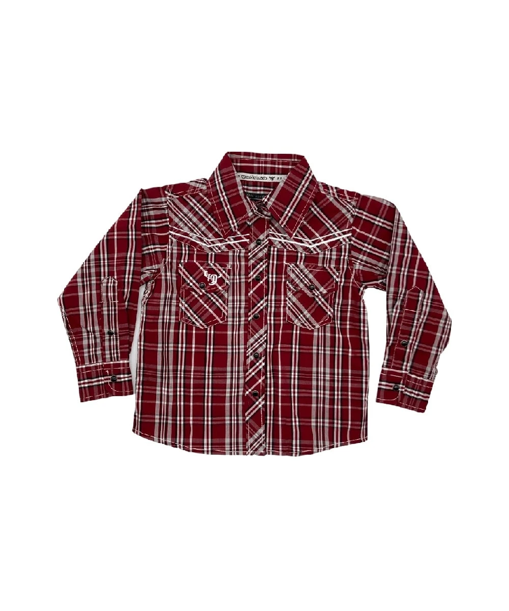 100% Cotton; Long Sleeve; Spread Collar; Snap Cuffs; Two Snap Flap Pockets; Single Point Front/Back Yokes; Embroidered Logo On Front Left Pocket; Embroidered Steer Head On Back Yoke; White Double Row Piping Yoke Accents; Color: Red/Black/White Plaid; Style #725470-225-T
