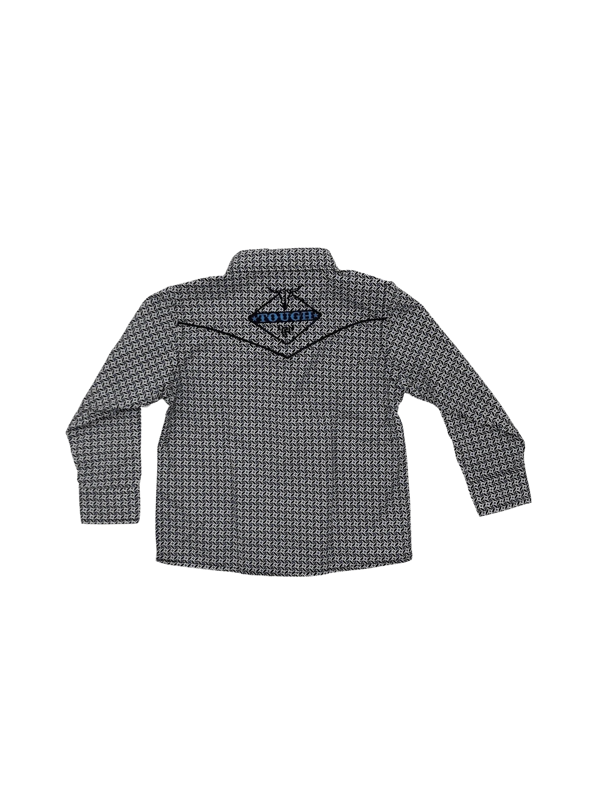 100% Cotton; Spread Collar; Snap Cuffs; Two Snap Flap Pockets; Single Point Front/Back Yokes; Yoke Piping Accent; Embroidered Blue Logo On Chest Pocket; Embroidered Black And Blue Logo On Back Yoke Reads: *Tough*; Color: Black, White And Blue Geometric Print; Style #725478-020-T