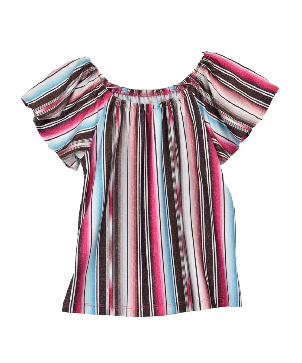 90% Polyester/10% Spandex; Elastic Neckline; Can Be Worn Off Shoulder; Short Flutter Sleeves; Vertical Multicolor Stripes; Style #435752-661-K