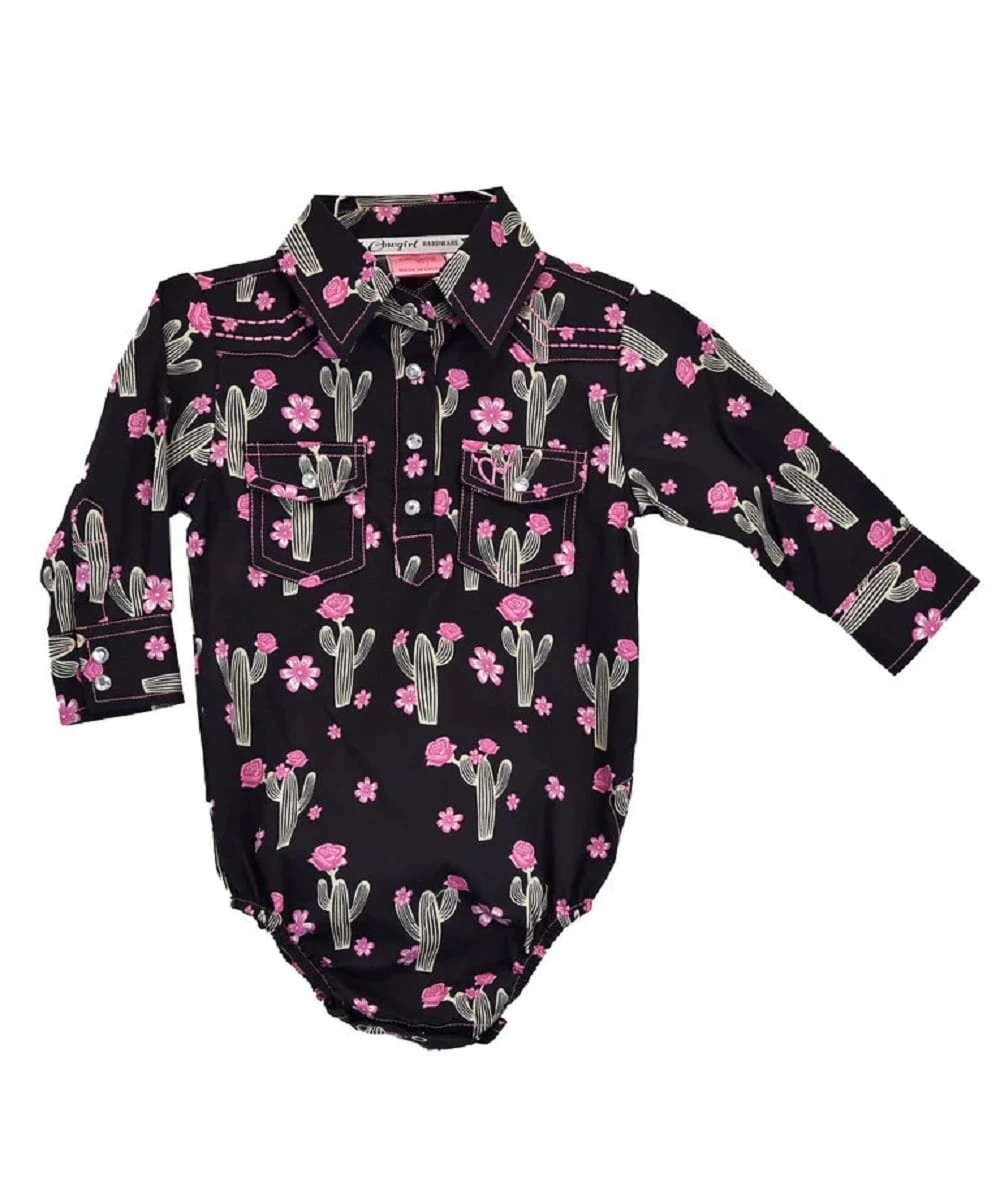 100% Cotton; Long Sleeve; Spread Collar; 1/4 Rhinestone Snap Closure; Two Snap Flap Chest Pockets; Western Yokes With Pink Stitching; Adjustable Snap Cuffs; Elastic Leg Holes; Three Snap Diaper Seat Closure; Color: Smoke Black With Allover Cactus Rose Print; Style #825526R-144-I