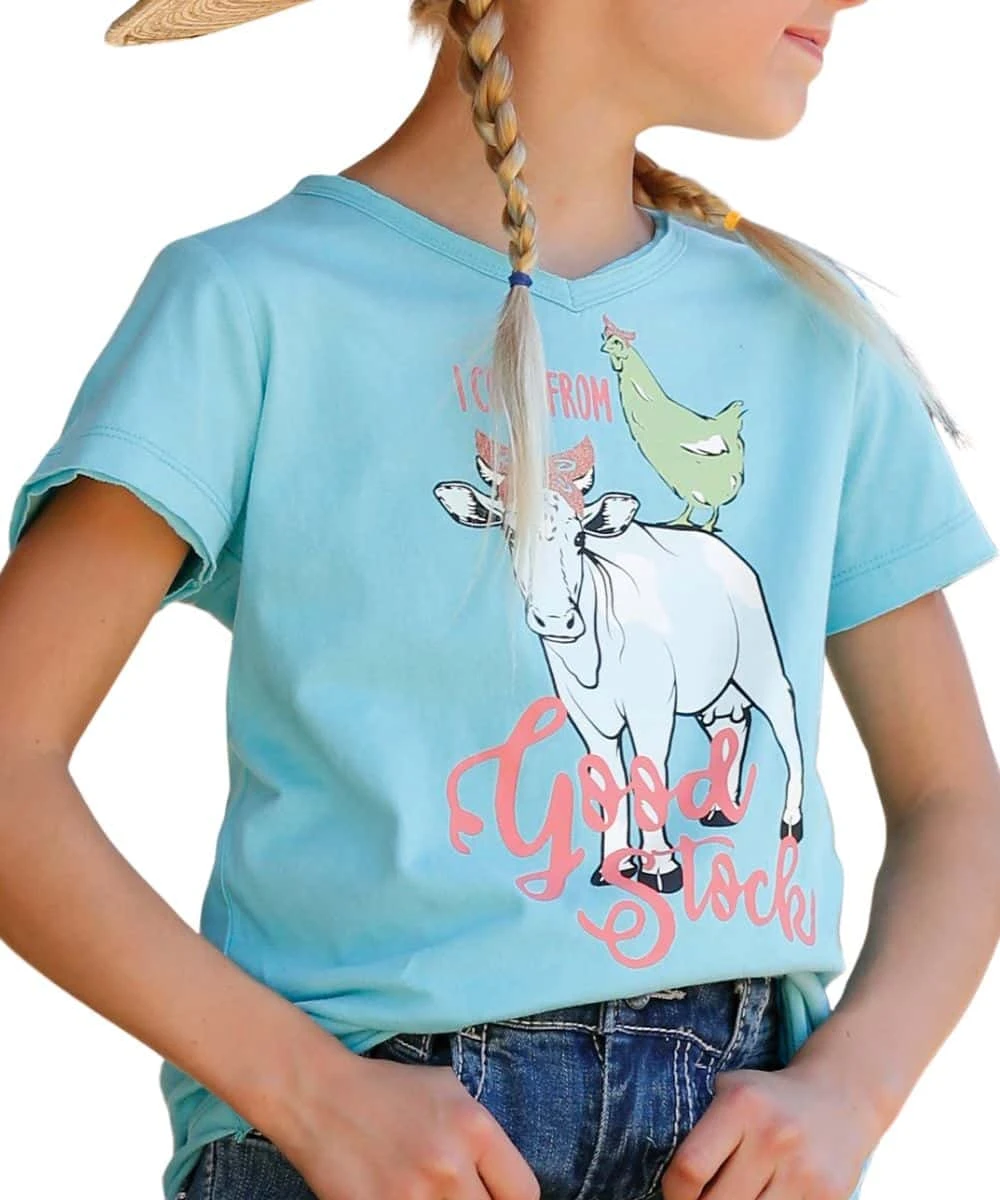 Cotton; Short Sleeve; V-Neckline; Front Screen Print Reads “I Come From Good Stock”; Blingy Glitter Detail; Raw Edge Hem; Color: Blue; Style #CTT8520002