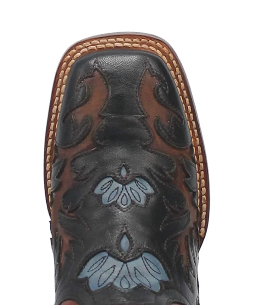 11″ Boot; Leather; Soft Leather Cutouts With Blue, Cream And Brown Underlay Flowers And Leaves Stretching From The Foot To The Top Scalloped Top Line; Leather Lining; Removable Antibacterial And Antifungal Soft Strike Orthotic; 1″ Stockman Heel; Broad Square Toe; Leather Outsole; Style #DP4109