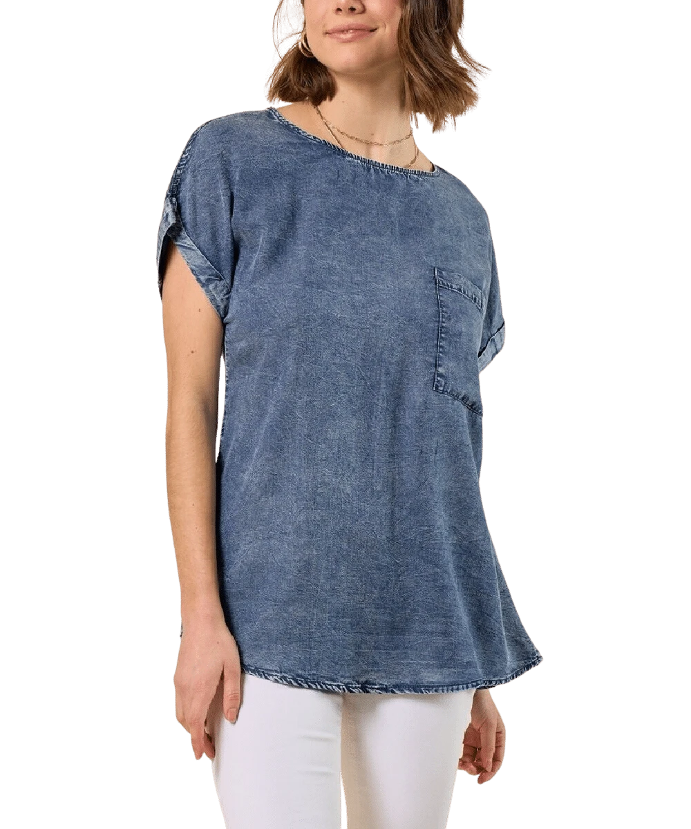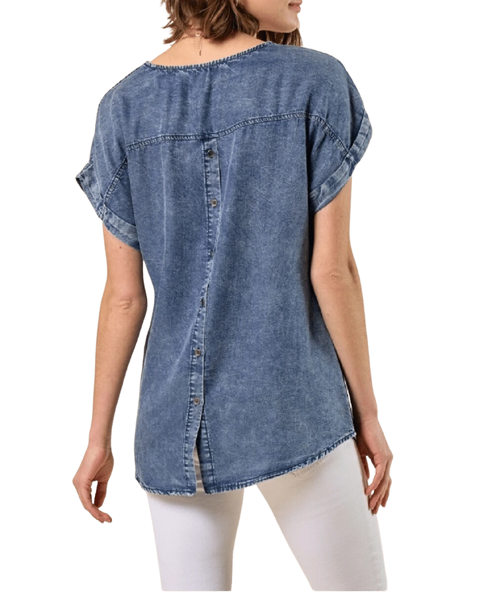 100% Tencel; Short Sleeve; Single Open Pocket; Button Up Back Placket; Stitched Sleeve Cuffs; Color: Denim; Style #40193T