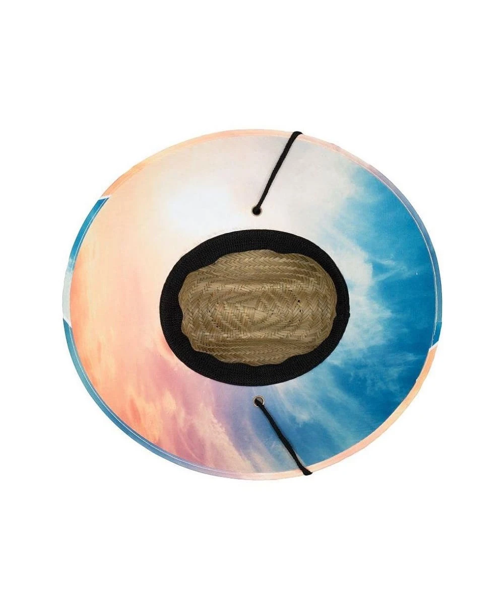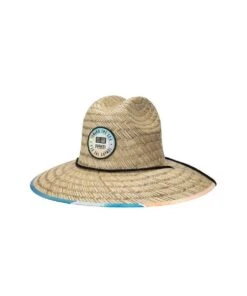 Rush Straw; 4 1/4″ Brim; Woven Patch On Front Crown; Turquoise, Blue, White, Orange And Coral Sunset Print Covered Underbrim; Chin Cord; Elasticized Sweat Band; Color: Natural; Style #MA112OS-NAT