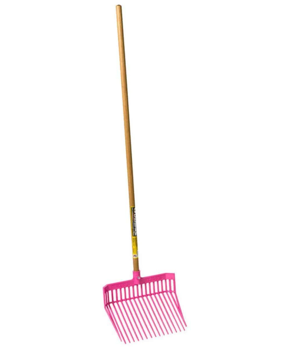Extra Strength Polycarbonate; Uniquely Angled Tines Provide Easy Pickup With Less Spilling; Designed For Long Lasting Use, Strength, And Flexibility; 52″ Wood Handle; Fork Head Measures Approximately: 13 1/8″ L x 15 1/8″ W; Color: Hot Pink; Style #12673-3