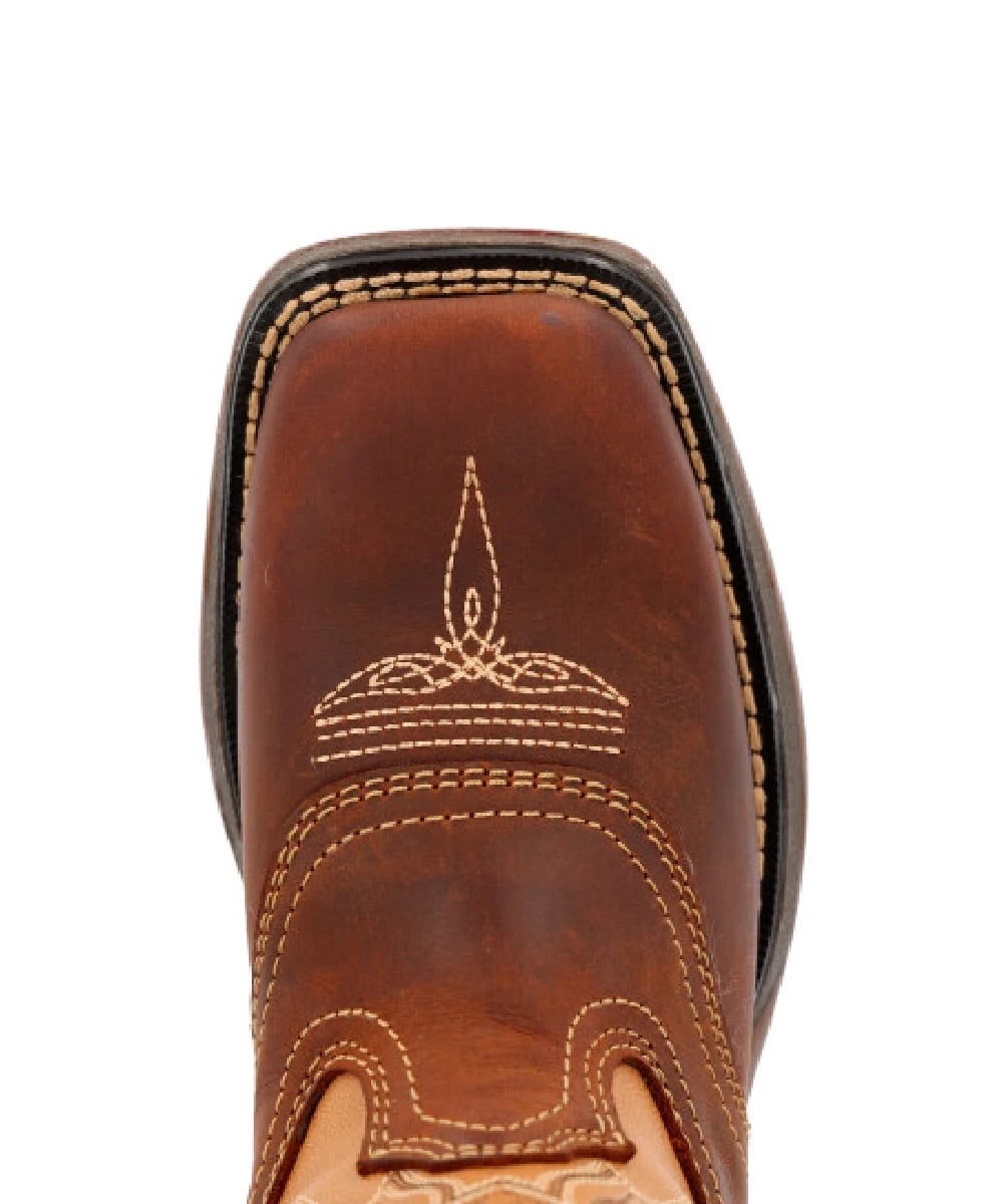 Full Grain Leather Foot, Collar And Pull Straps; Soft Mesh Lining; Cushion Flex Insole; Fiberglass Shank; Rolled Shank Area; Double Row Sole Stitch; 1″ Heel; Square Toe; Rubber Outsole; Color: Brown Foot And Collar/Tan Shaft; Style #DBT0240C
