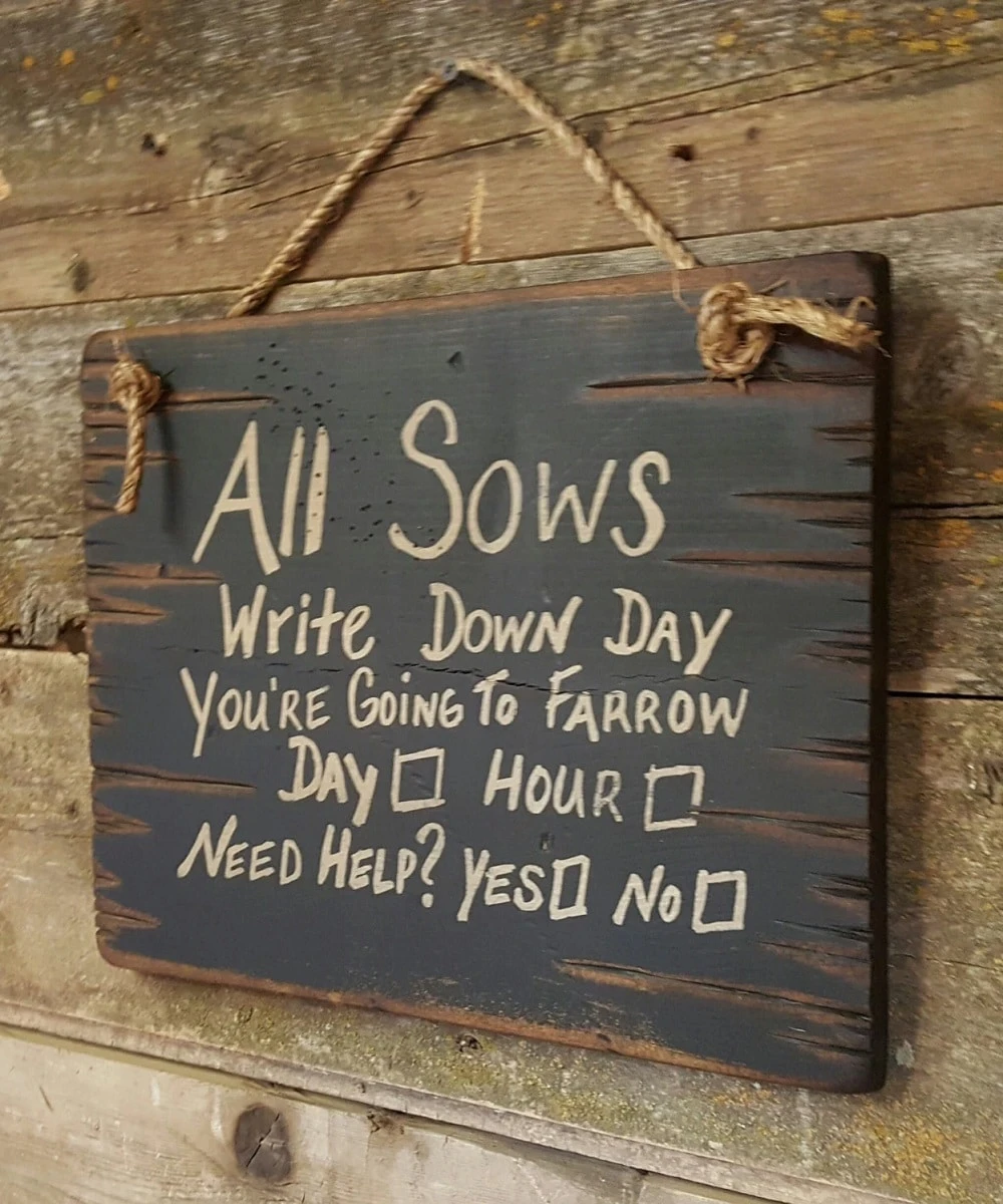 Antiqued Black Wooden Sign Reads: “All Sows Write Down Day You’re Going To Farrow Day? Hour? Need Help? Yes Or No?”; Measures Approximately: 11″ x 14″; Rope Handle; Style #8288
