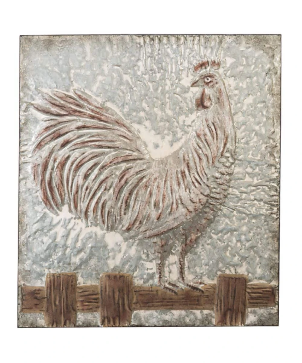 Tin Wall Hanging; White Enamel Embossed Rooster; Two Wall Mounts On Back; Measures Approximately 22.5″ W X 2″ D X 25.25″ H; Style #CB174023
