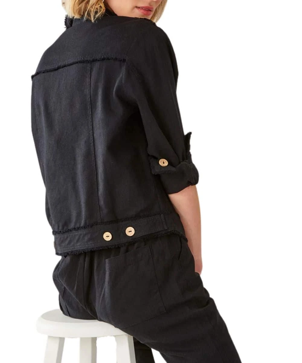 55% Linen/45% Viscose; Long Sleeve Jean Style Jacket; Open Collar; Button Front Closure And Cuffs; Open Hand Pockets; Deconstructed Feathered Fringe Hem; Lightweight Breathable Construction; Color: Black; Style #408499