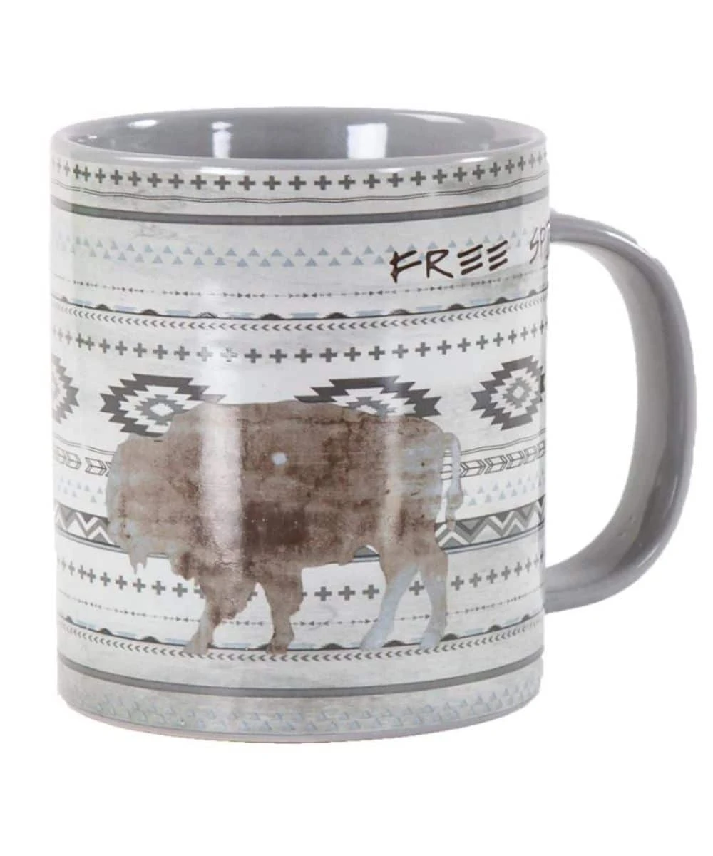 Ceramic; 20 Oz Capacity; Design Says “Free Spirit” With Neutral Southwest Pattern And Earth Toned Buffalo Silhouette; 4 Piece Set; 4.5″H x 3.75″D; Microwave Safe; Dishwasher Safe; Style #MG1835