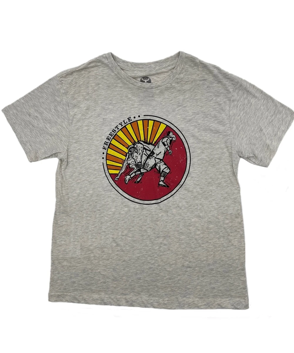 99% Cotton/1% Polyester; Crew Neck; Graphic Tee Front Red, Orange And Yellow Rodeo Print; Color: Heather Gray; Style #HT1406GY
