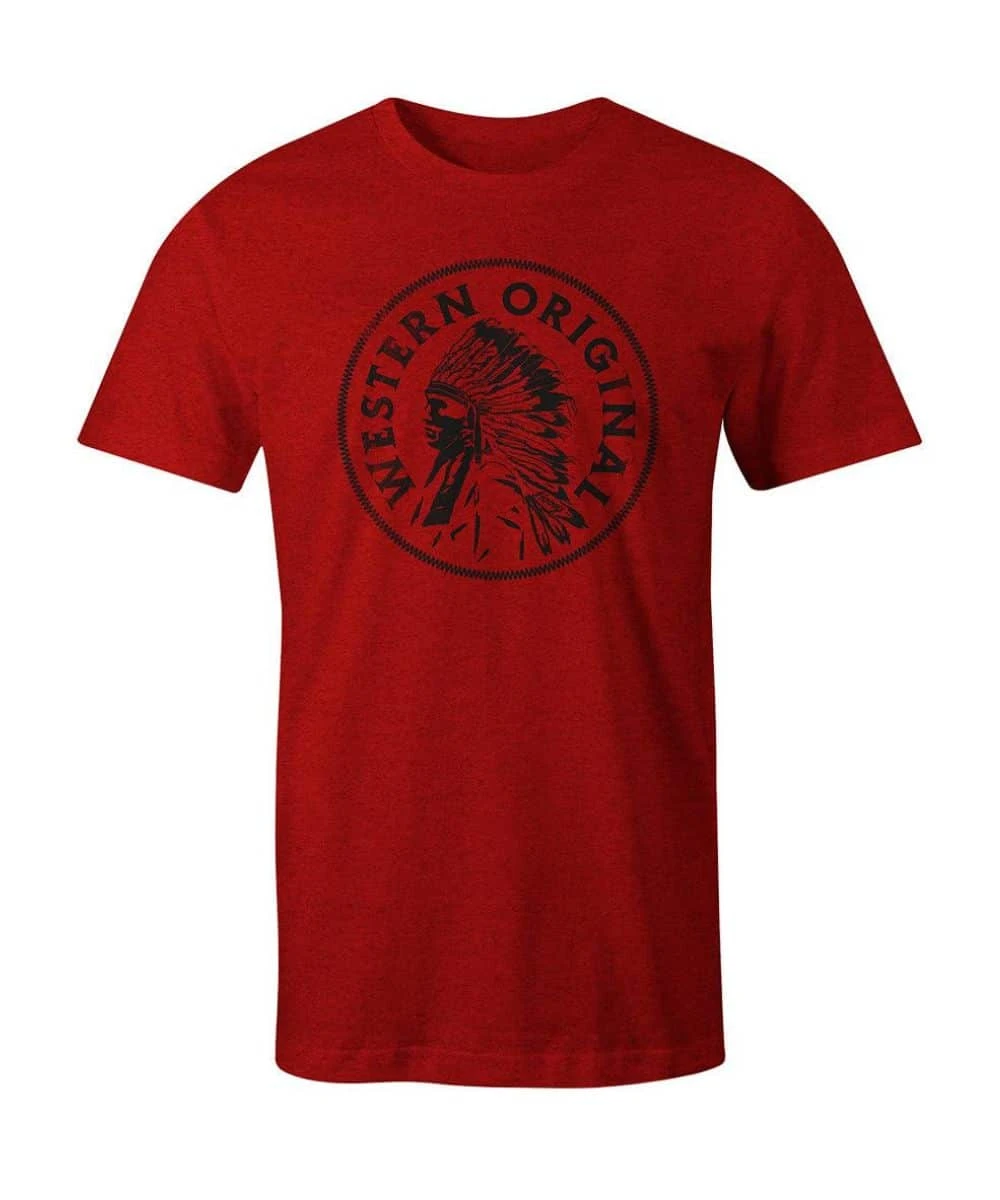 50% Cotton/50% Polyester; Color: Red; Short Sleeve; Black Graphic Print Of Quanah With Wording ‘Western Original’; Athletic Fit; Soft Feel; Style #HT1517RD