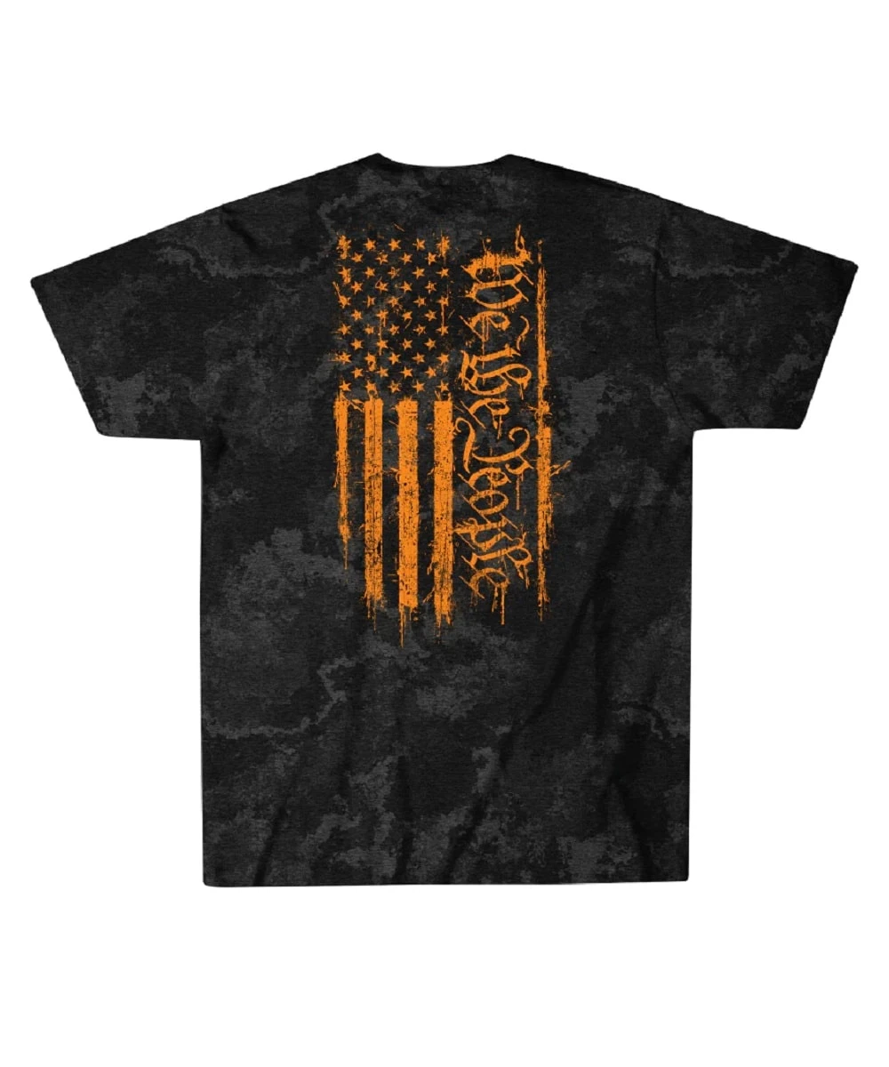 100% Cotton; Relaxed Fit; Short Sleeve; Crew Neck; Orange We The People Flag Graphic Print On Front Left Chest And Back; Black And Grey Marble Design; Color: Heather Grey; Howitzer Clothing Donates 5% Of The Proceeds To Benefit The American Heroes Who Sacrifice To Protect Us To: Wishes For Warriors, Rise Above Hardship, National Law Enforcement Memorial Fund And The National Fallen Firefighters Foundation; Style #CV4493