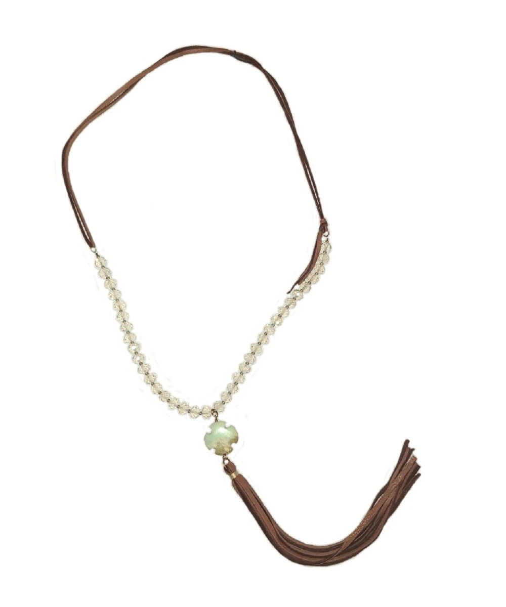 30″; Dark Brown Leather Back; Clear Crystal Beads; Stone Pendant With Dark Brown Leather Tassel; Style #16093