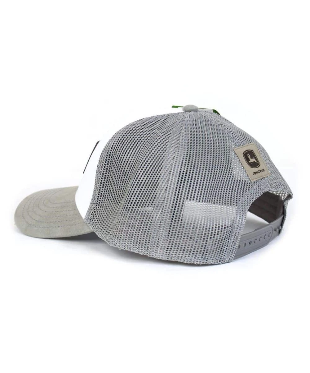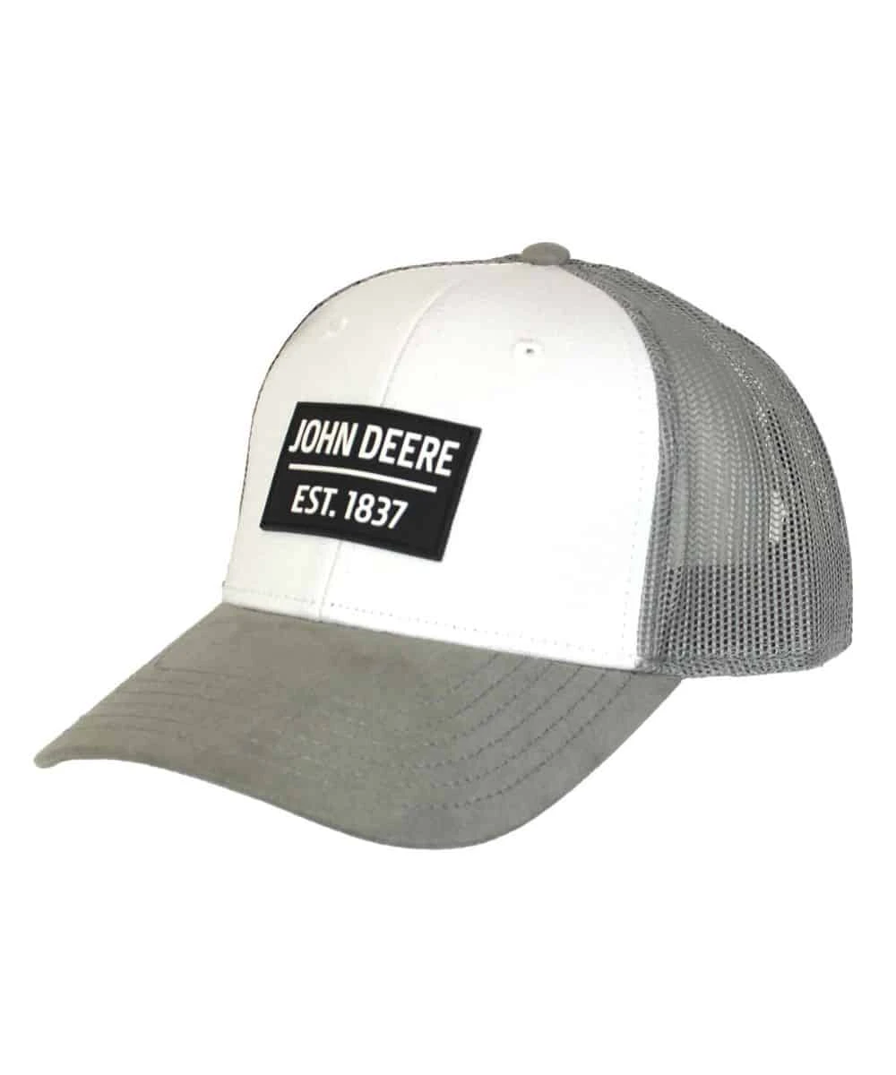 6 Panel Construction; White Front Panels; Gray Faux Suede Brim; Charcoal Rubber Patch On Front Center; Patch Reads: John Deere Est. 1837; Gray Mesh Back; Snap Back Closure; Style #13080875