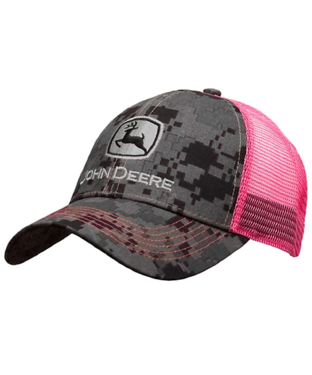Six Panel Construction; Olive Green And Black Digital Camo Front Crown And Bill; Pink Mesh Back; Pink Accent Stitching; Front Center Crown Embroidered John Deere Logo; Snap Back Clsoure; Style #23080419