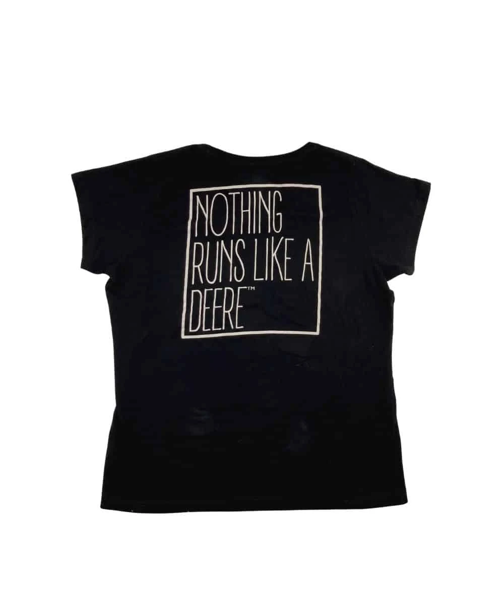 100% Cotton; Color: Black; Scoop Neck; Gray John Deere Logo On Left Chest; Short Sleeves; Back Says “Nothing Runs Like A Deere”; Style #23375741