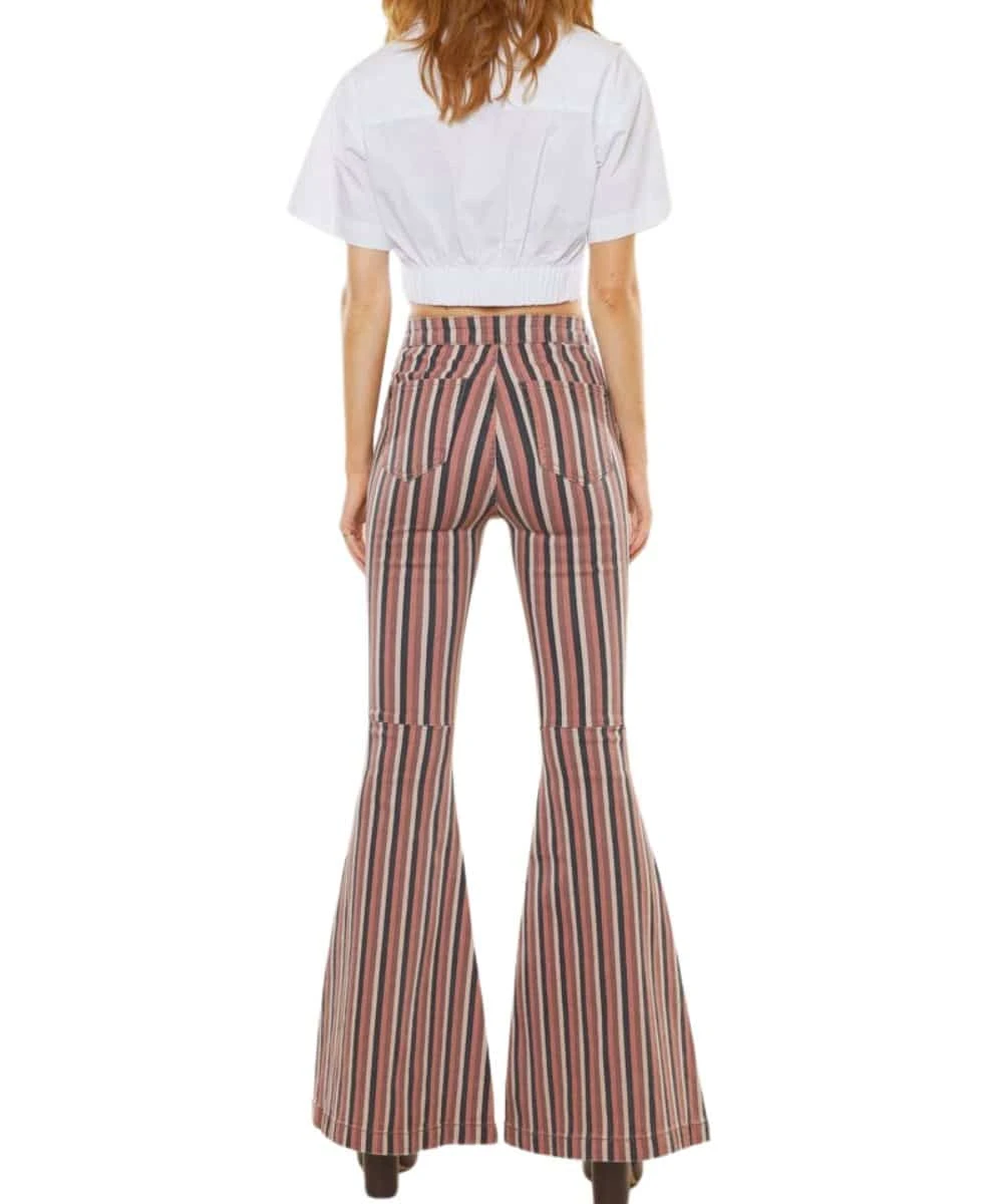 76% Cotton/5% Polyester/ 17% Rayon/2% Spandex; High Rise; Zip Fly With Button Closure; Two Back Pockets; Back Dart Detail; Cut Seam At Back Of Knee; Wide Hem; Super Flare Jean; Color: Multicolor Stripe; Style #KC5246BG