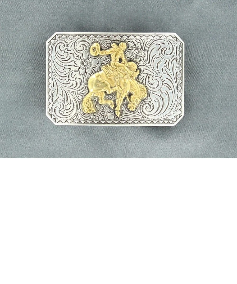Silver Rectangle; Floral Scroll Engraving; Gold Bucking Bronc And Rider; Triangle Edge; 2″ x 3″; Style #37558