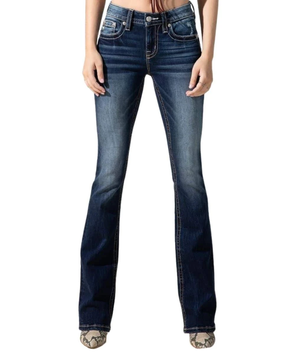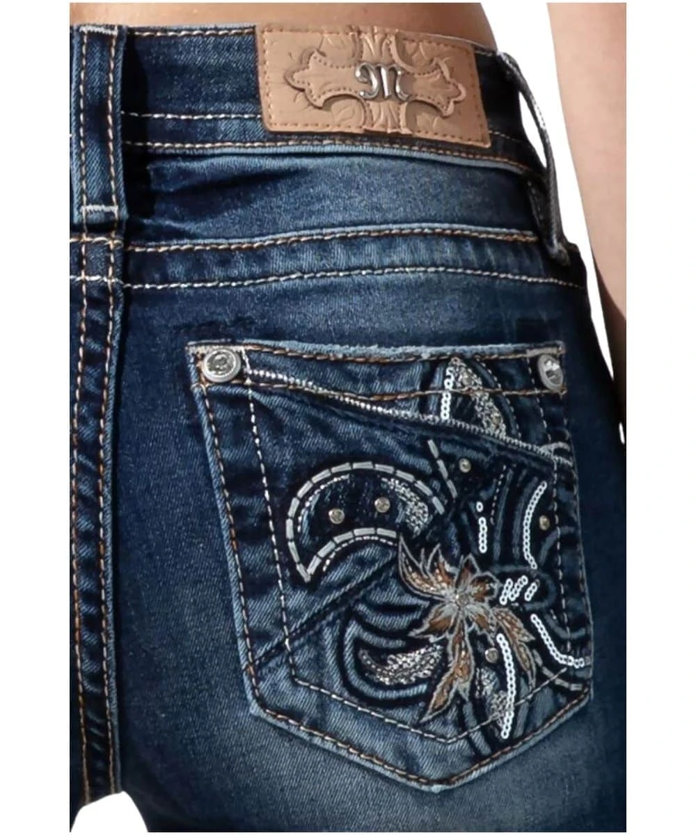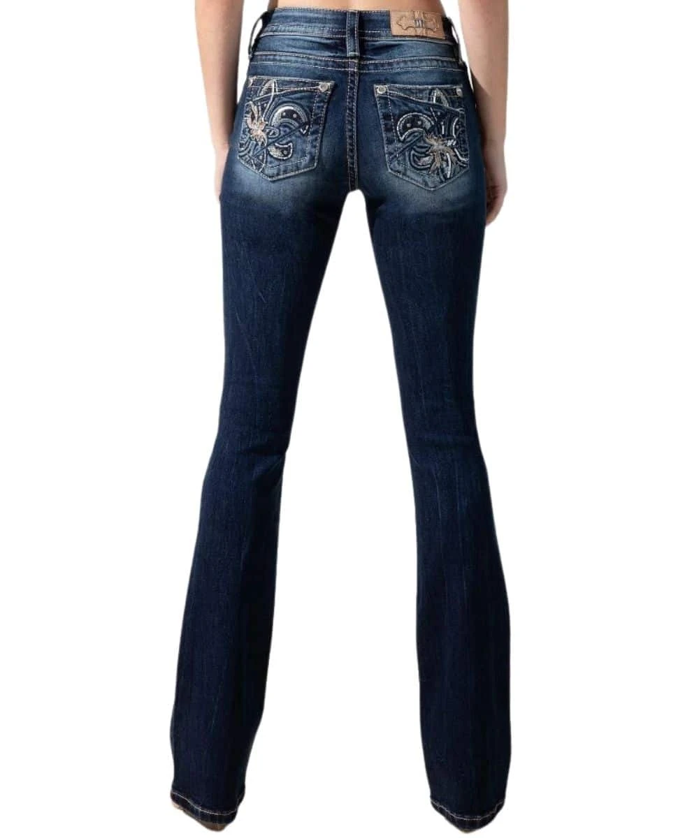 93% Cotton/ 5% Polyester/ 2% Elastane; Color: Dark Wash; 5 Pocket Construction; Mid-Rise; Bootcut; Whiskering; Embroidered Fleur De Lis With Piecing, Studs, And Rhinestone Rivets; Inseam: 34″; Style #M3939B