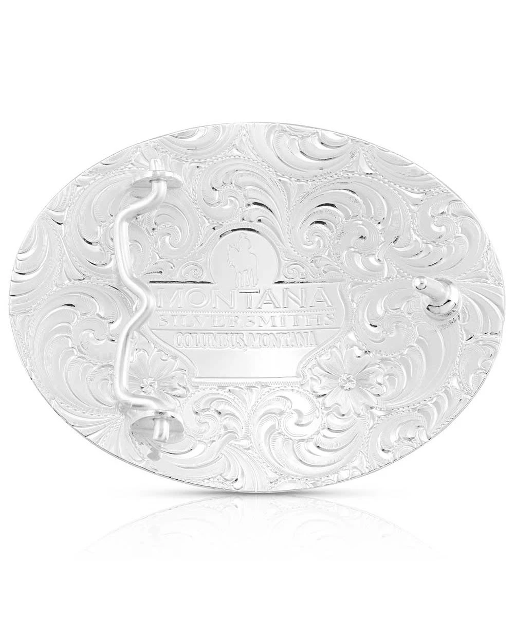 99.99% Fine Silver/Rose Gold/Gold Plated Over Brass Base; Oval Shaped Belt Buckle; Flying American Flag In Silver Tone With Rose Gold Tone Embellishments; Expertly Crafted With Gold Tone Sculpted Flying Bald Eagle And The Words “American Made”; Gold Tone Beaded Trim; Standard 1.5″ Belt Swivel; Montana Armor To Prevent Tarnish; Measures Approximately: 3.3″ W x 4.3″ H; Style #49910