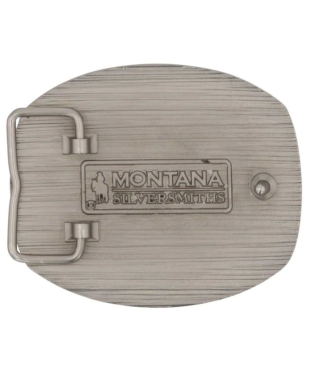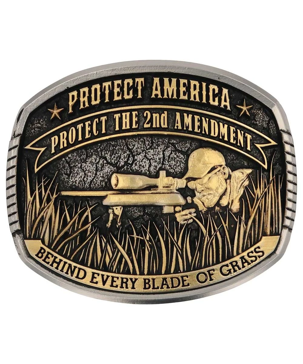 Silver And Brass Plate Over Brase Base; Square Shaped Belt Buckle With Rounded Corners And Plumped Sides; Smooth, Notched Trim With Gold Toned Sniper Within Grass In Center; Antiqued Silver Background With Crackling Texture; The Words “Protect America. Protect The Second Amendment. Behind Every Blade Of Grass.” Laid On Top; Montana Armor To Help Prevent Tarnish; Standard 1.5″ Belt Swivel; Style #A896CK