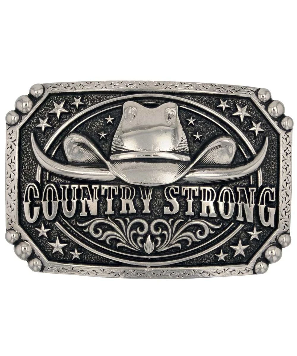 Silver Over White Metal Alloy; Belt Buckle Reads: “Country Strong” In Silver Tone Design; Cowboy Hat Paired With Horns; Stars Accent Center Piece; Filigree And Beads Border Trim; Standard 1.5″ Belt Swivel; Measures Approximately: 2.63″ W x 3.82″ H; Style #A954
