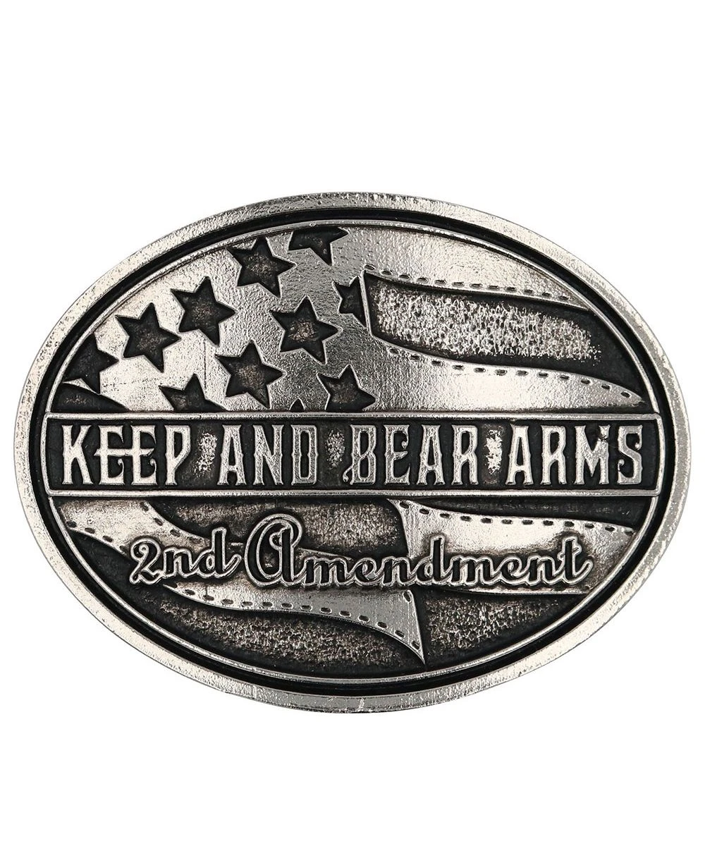 Silver Over Solid Cast White Metal Alloy Base; Oval Shaped Belt Buckle; Darkened American Flag Background; Ribbon Wording Reads: “Keep And Bear Arms”; Under Ribbon Reads: “2nd Amendment” In Scroll Lettering; Low Profile Trim; Montana Armor Protective Finish To Prevent Tarnish; Standard 1.5″ Belt Swivel; Measures Approximately: 4.12″ W x 3.13″ H; Style #A876