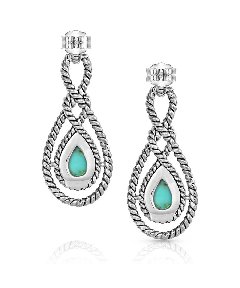Silver Over Brass; Simple Rope Knot Design; Synthetic Turquoise Oval Stone Centerpiece; Wrapping Around To Create Open Design Is Silver Tone Twisted Rope; Hypoallergenic Stainless Steel French Wire; Style #ER5468