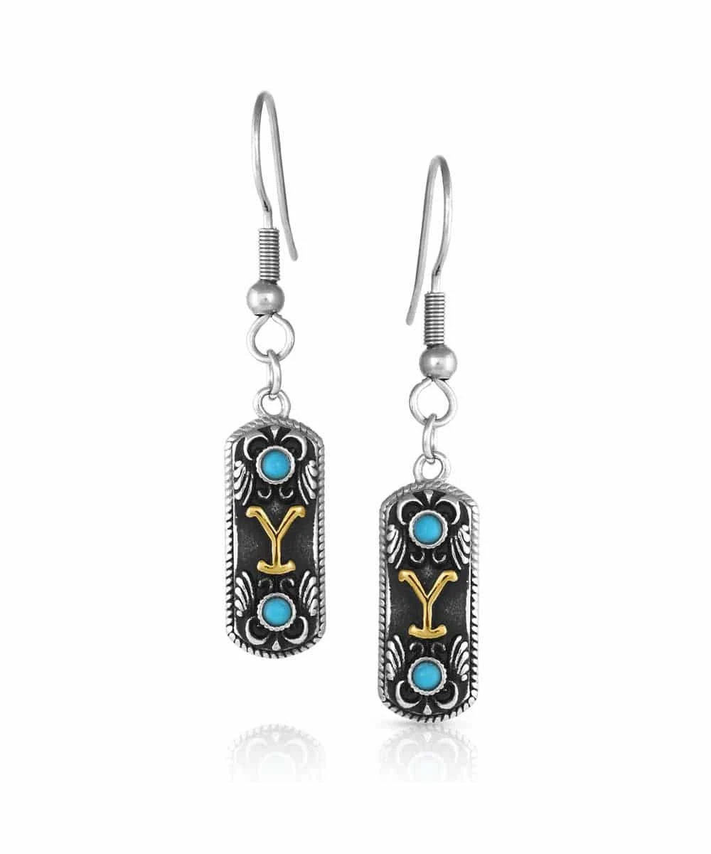Stainless Steel/Gold Over Brass Base; Gold Tone Dutton Family “Y” Brand In The Center With A Turquoise Stone Above And Below; Silver Tone Embellishments With Dark Antiquing; Dangle Earrings Hang From Hypoallergenic Stainless Steel French Hook; Style #YELER5479