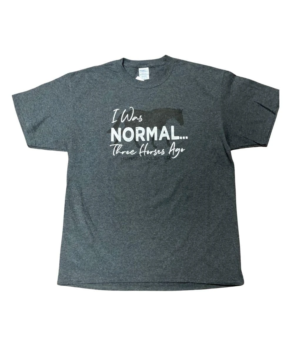 50% Cotton/ 50% Polyester; Color: Heather Gray; Design Says “I Was Normal…Three Horses Ago” With A Horse In Background; Crew Neck; Short Sleeve; Style #UH-7667