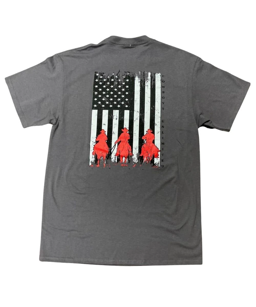 50% Cotton/ 50% Polyester; Color: Charcoal; Design Is A Flag With 3 Cowboys On Front And Back; Crew Neck; Short Sleeves; Style #CB-1597